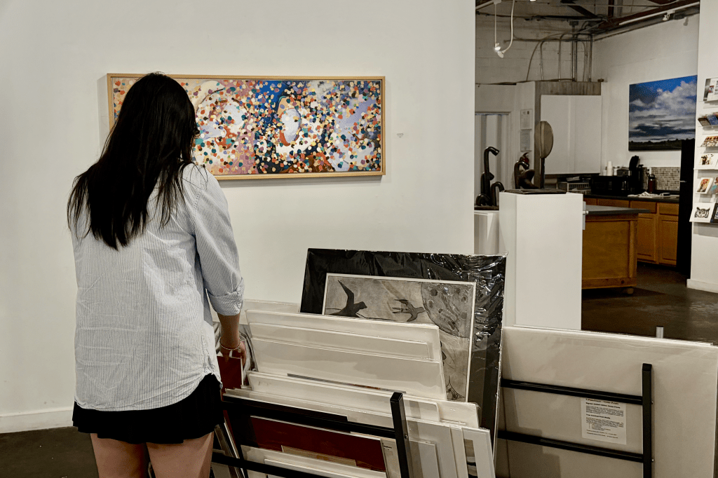 A Rice University student browses prints made by local artists at Archway Gallery in Montrose, Houston. Photo by Faith Choi, Houston Newsroom.