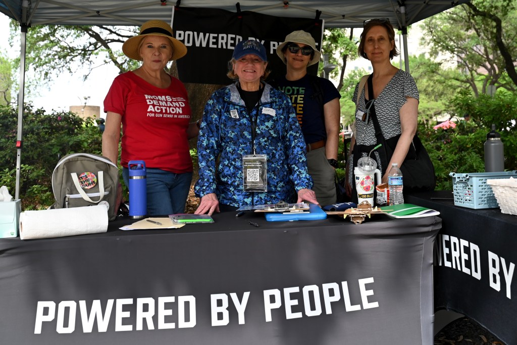 Powered by People volunteer Carol Whitmore (center left) stands in the group’s booth at March 28th’s No Kings rally in downtown Houston. During the 4 hour event, they say they spoke to hundreds of marchers, some of which signed up to volunteer in the future.