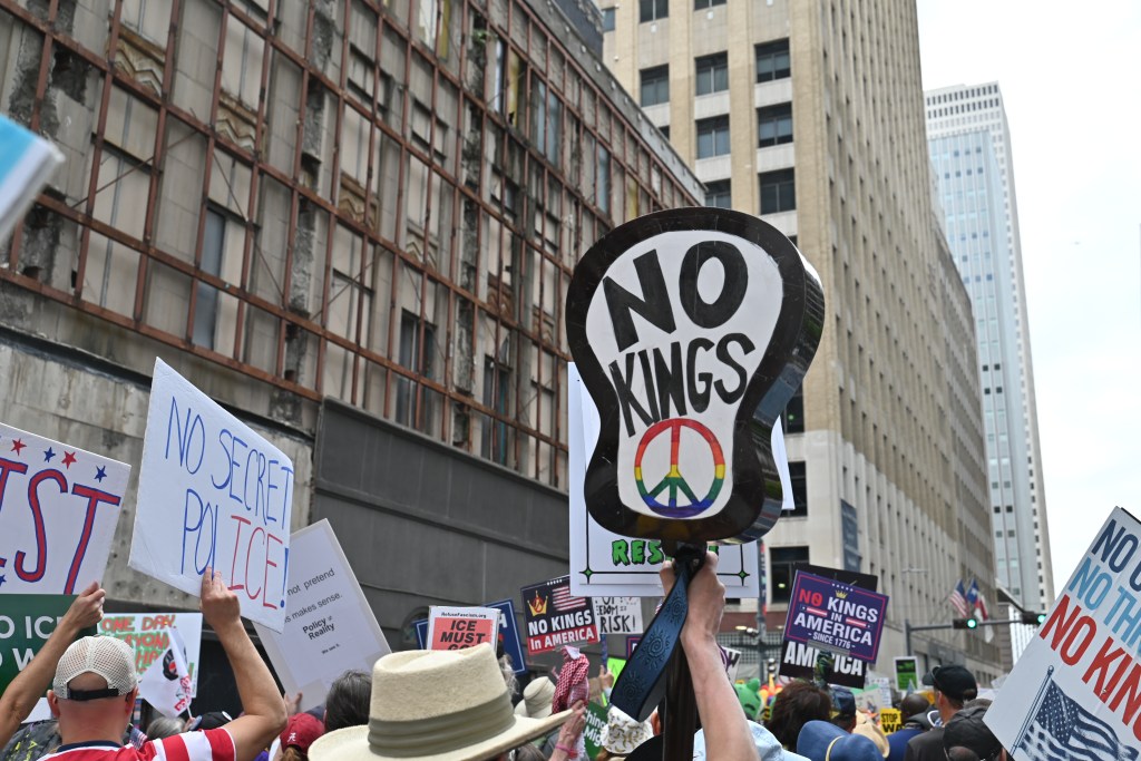Protestors march outside Houston City Hall at March 28th’s No Kings Rally. Many protestors brought handmade signs, some calling for the defunding of ICE, others attacking President Trump.